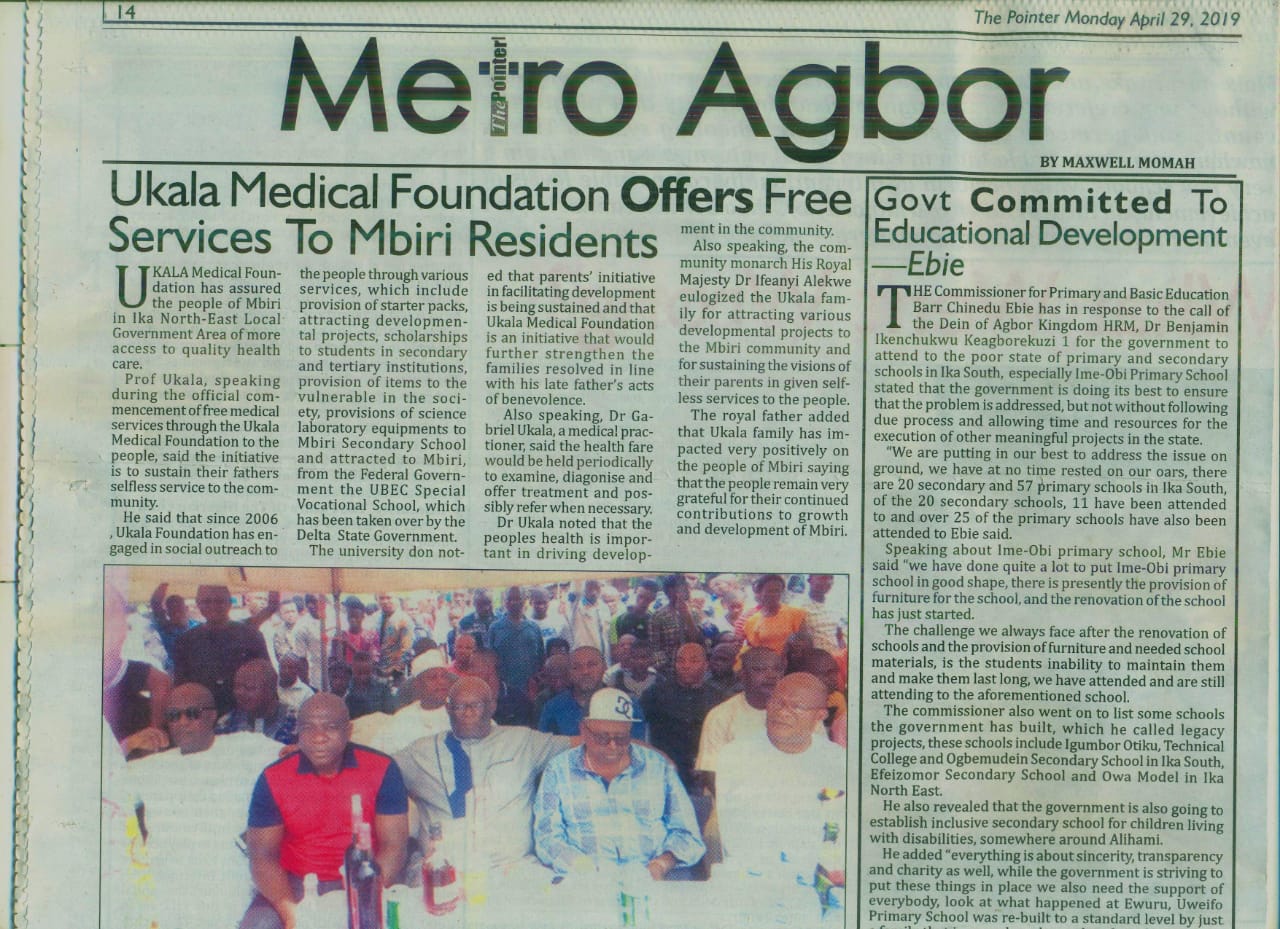 The Ukala Medical Foundation featured in the Metro Agbor Newspaper on April 29 2019.